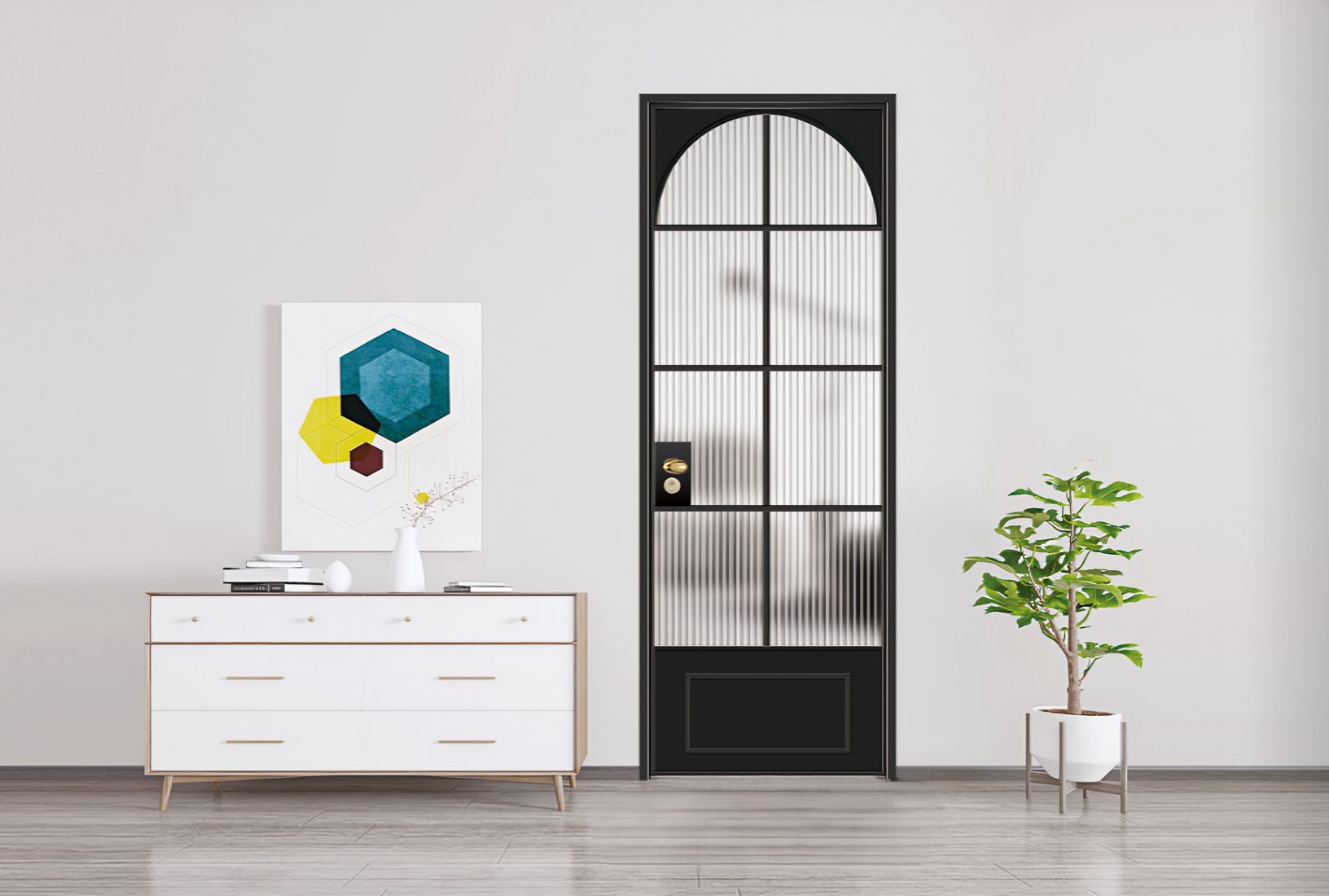 Introducing the Arched Elegance Door, a perfect blend of modern design and classic sophistication. This door features a striking arched top, divided into sections with frosted glass panels adorned with subtle vertical lines. The black frame enhances the door's sleek appearance, making it a stylish addition to any contemporary or traditional interior. Ideal for living rooms, dining areas, or home offices, the Arched Elegance Door not only offers aesthetic appeal but also ensures privacy while allowing light to permeate through. Elevate your space with this timeless piece. Order now to bring elegance and functionality to your home.